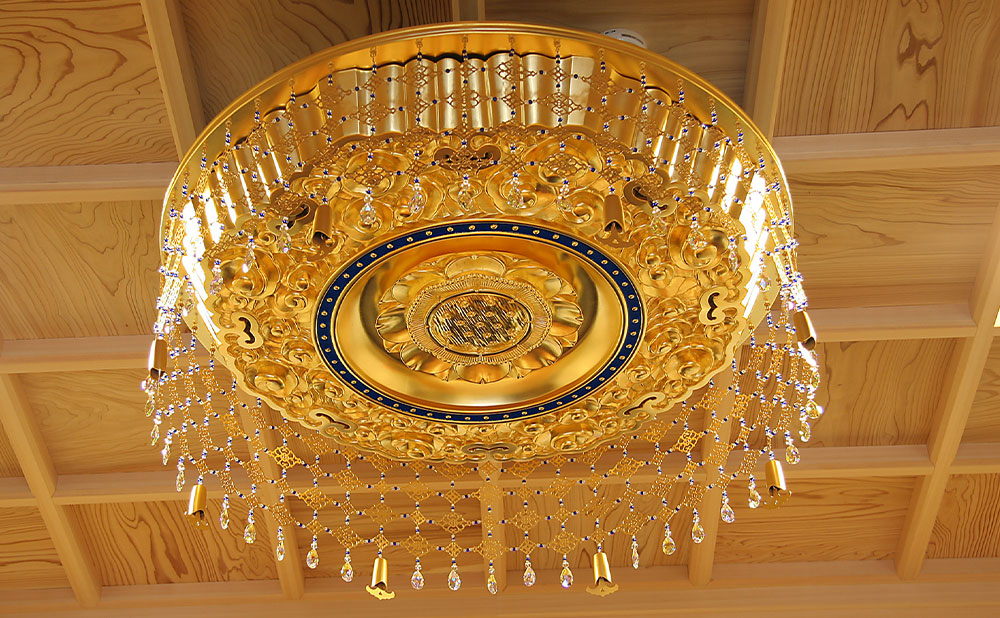天蓋とは、サンスクリット語で「chatra(チャトラ)」といい、天に懸けられた蓋(かさ)のことです。お寺の本堂の中にある仏様または住職の座る場所の頭上を覆っています。お釈迦様のおられたインド周辺は熱暑が厳しく、貴人の上に蓋をかざして歩いていたことから、貴尊のシンボルとされました。