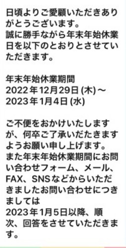 弊社の年末年始の休業のご案内です。 年末年始休業期間 2022年12月29日(木)〜2023年1月4日(水)まで休業とさせて頂きます。 ご不便をおかけしますが、何卒ご了承いただきますようお願い申し上げ...