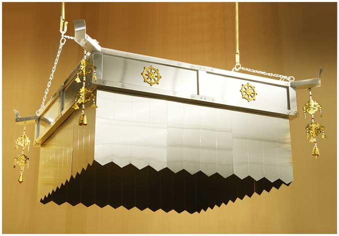 【受注生産品】 軽量型護摩天蓋 アルミ製 胴幅105cm(3尺5寸) 隅瓔珞付 輪宝紋 京仏具作島オンラインショップでは仏具などご紹介しています。 お時間ございましたらご覧ください。