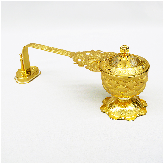 打物製落とし付柄香炉です。 柄香炉は香炉に持ち手をつけた物で手に持って焼香供養を行うために使用されます。 銅製の金メッキ仕上げです。 蓋には丁番が付いています。 また京仏具作島オンラインショップ柄香炉...