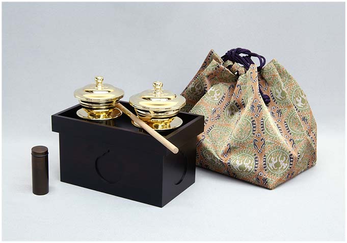 二器箱セットです。 野外などへの持ち運びに便利な二器箱セットです。 二器とは洒水器と塗香器を合わせて二器と言われています。 洒水器と塗香器、散杖、水滴をセットしています。 蓋を裏返すことで台としてご使...