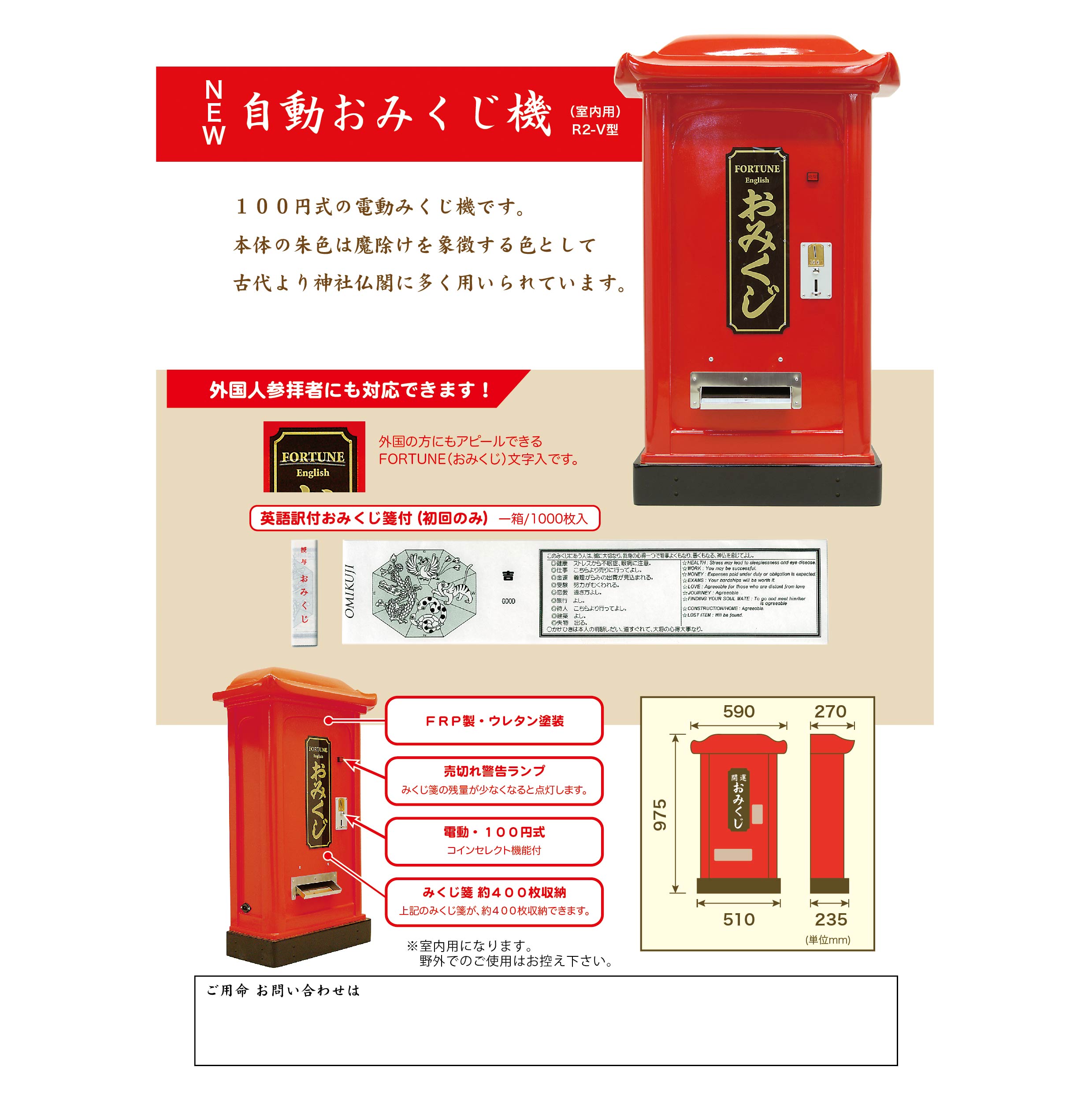 100円式(セレクト可)で売切れ警告ランプ付の電動おみくじ機です。 売り切れ警告ランプはみくじ箋が少なくなると点滅します。
