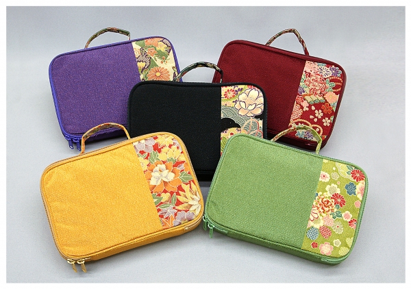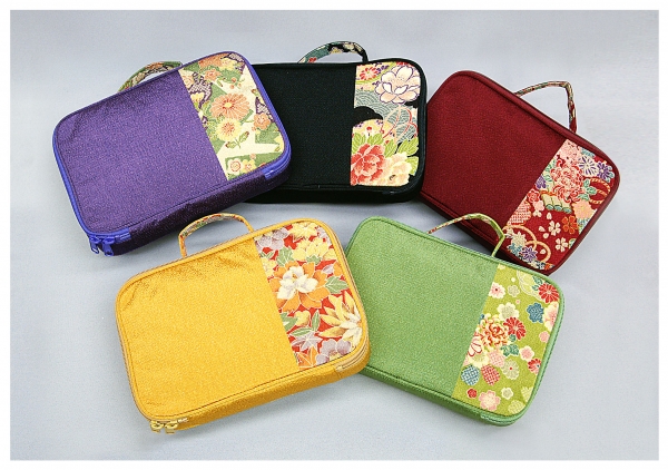 友禅柄のおしゃれなバッグ五色です。 緑(青)は東の守護色です。 エンジ(赤)は南の守護色です。 黒は北の守護色です。 黄は大地の色であり太陽の色でもあります。 紫は古代には高貴な人にしか許されなかった色です。 どの色も私たちにとって重要な色なのです。