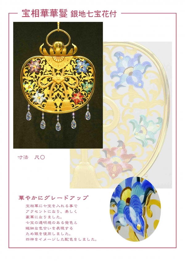 宝相華の華鬘に色鮮やかな七宝の花が施されています。