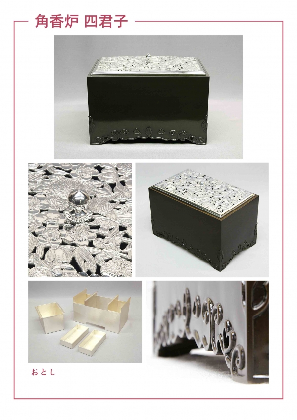 香炉の蓋には四君子(蘭、竹、菊、梅)の彫金が施されています。