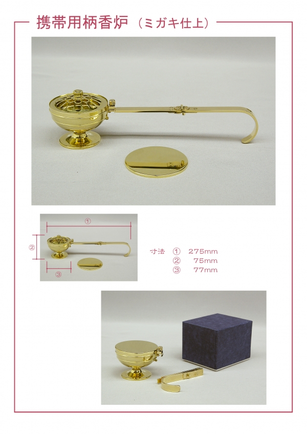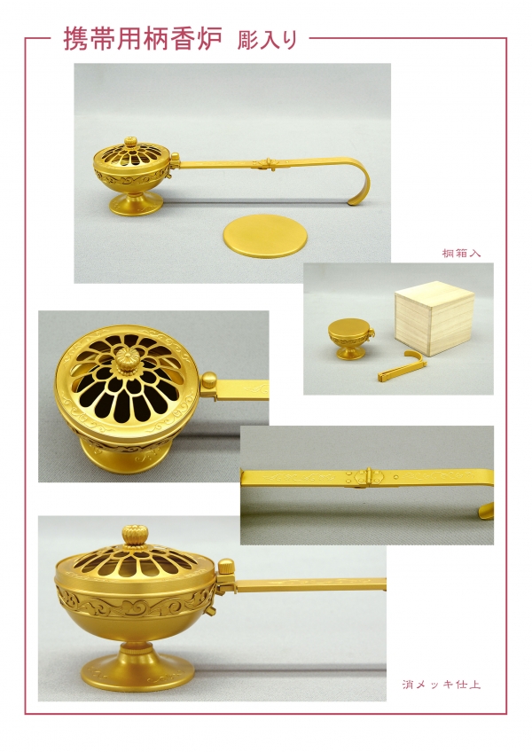 彫入り消しメッキ仕上げ:ワンポイントで椀の胴には唐草の透かし彫りが施してあります。 ミガキ仕上げ:シンプルな柄香炉です。 |