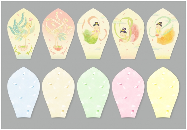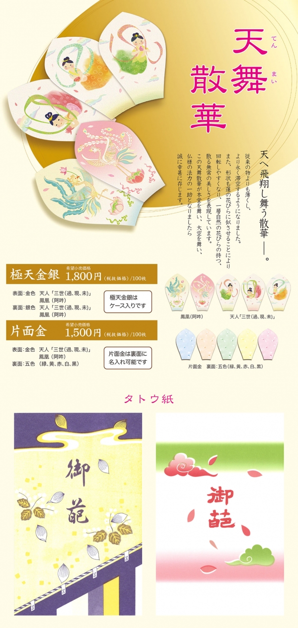 従来のものより薄くし、より長く滞空するようになりました。 また、形状も蓮の花びらに似せさせることにより回転しやすくなり、一層自然の花びらの持つ、散る無常の美しさを表現しています。 この天舞散華が本堂を舞い、大空を舞い、仏様の法力の一助となりましたら誠に幸甚に存じます。 |