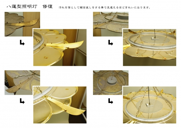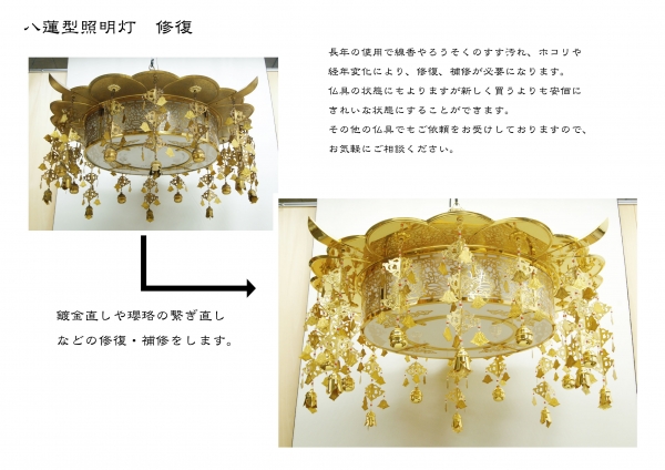 長年お使いになられてホコリやヤニで汚れた照明灯(吊灯篭)の修復・修理をすることでお堂などが明るくなります。 破損部分の修理・修復! メッキ直し! プラスチィック板の交換! 瓔珞の繋ぎ直し!電装器具の交換(蛍光灯→LED)! などあります。 汚れてきたな、直せないかな、きれいにしたいな、などお考えの際にはご相談ください。 |