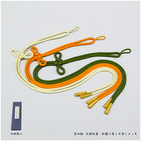 真鍮製 本金消しメッキ仕上げの別製六角型シズが先端に付いています。 *通常の真鍮製シズ 磨き仕上げ人絹紐と金メッキ仕上げ正絹紐もございます。 |