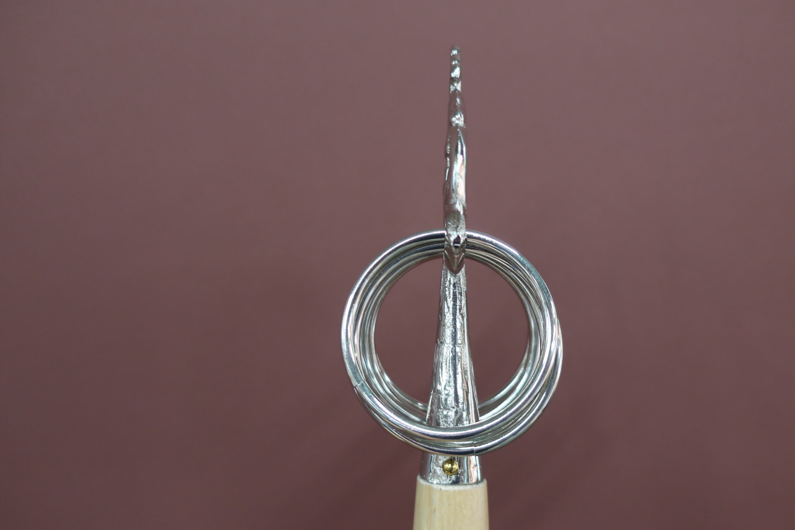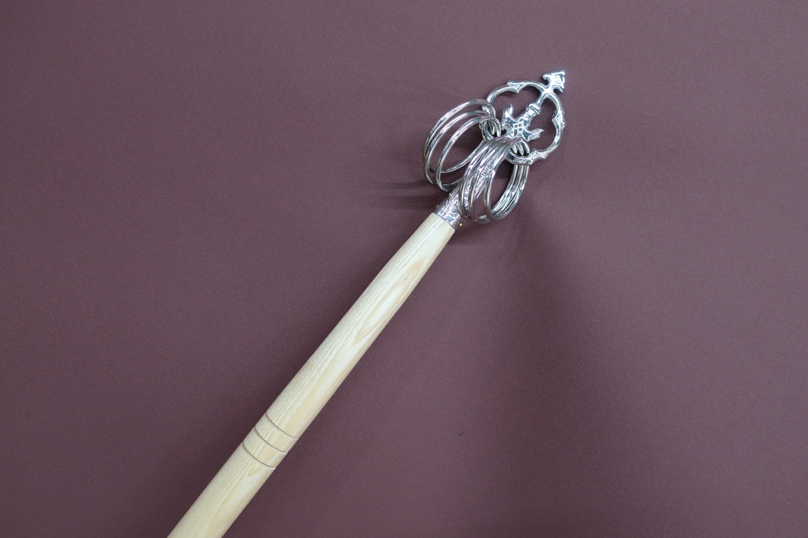 白木長柄4.5尺 柄の直径2.5㎝ 錫杖 並6釻(中)高さ約11.5㎝ 横幅約5.2㎝ 全長は約144㎝ |