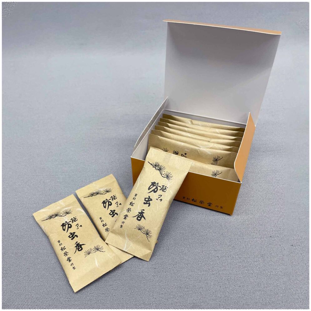 先人たちの調合を紐解くと、白檀・丁子・柱皮・竜脳に忌避効果(防虫効果)がある事が知られています。 匂い袋・防虫香にはこれらの香料を基本原料として使用しています。 春秋にお取替えいただければ、そこはかとない移り香とともに防虫に役立ちます。 衣類・書巻・軸物・毛筆・雛人形などの保管にご使用ください。 |