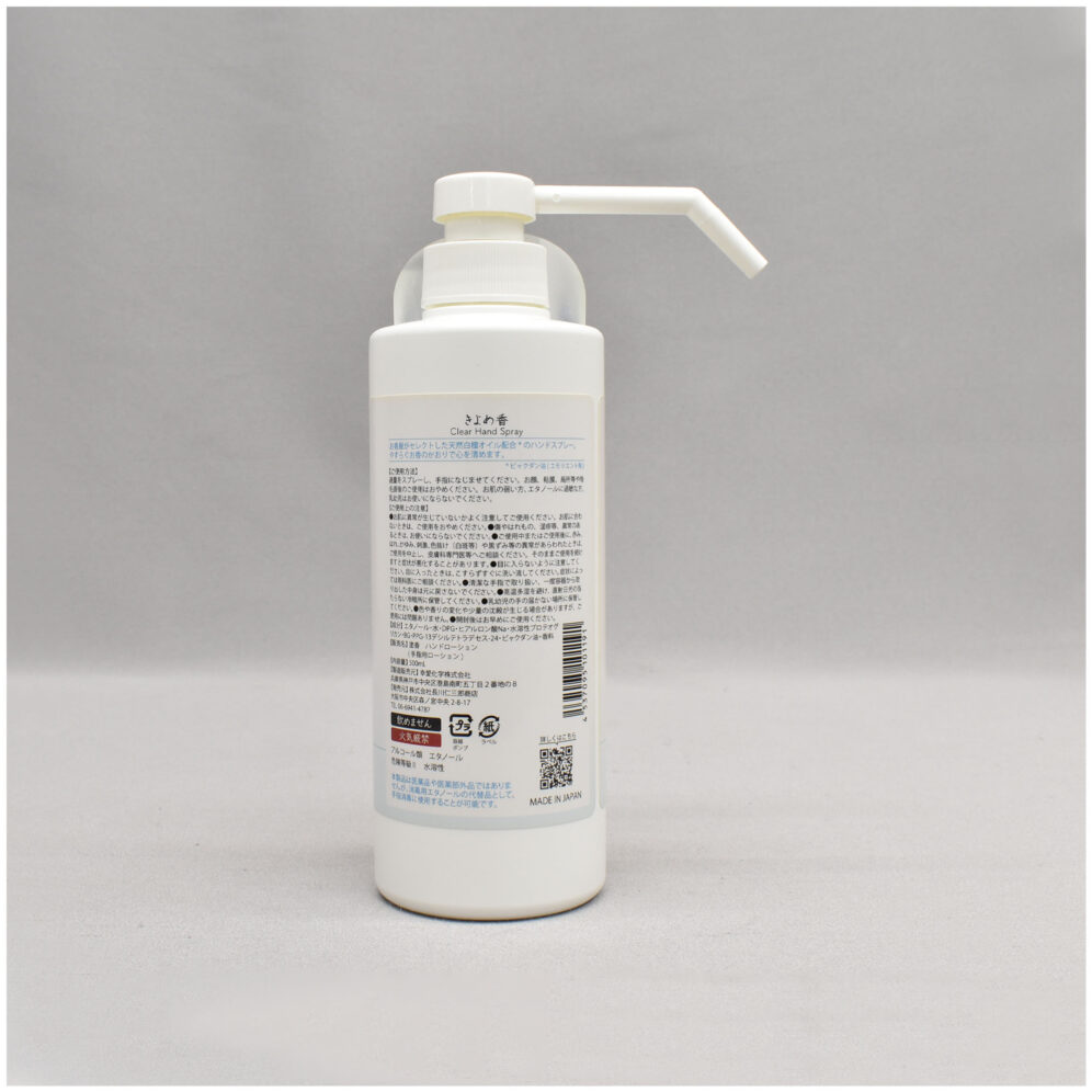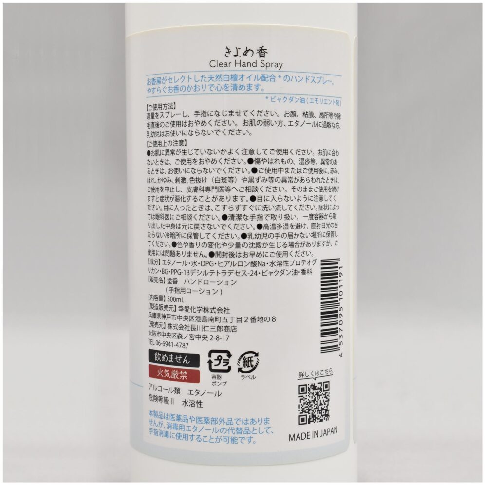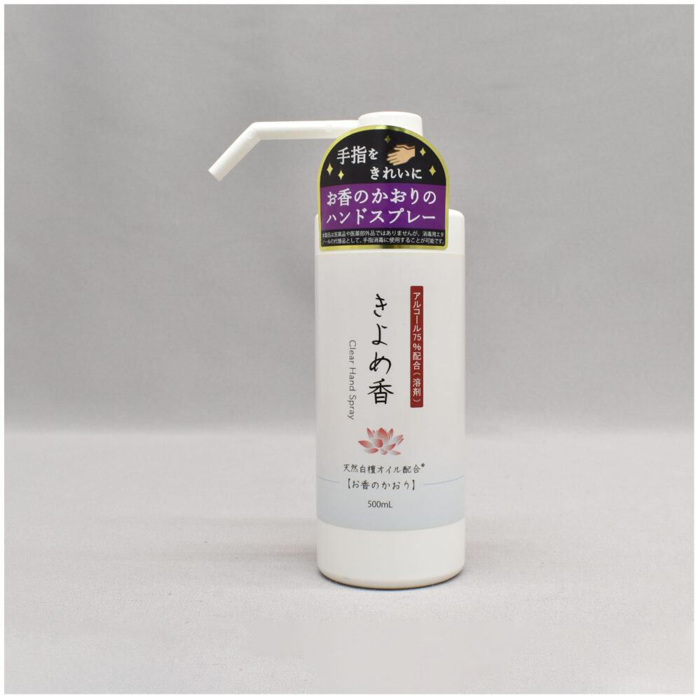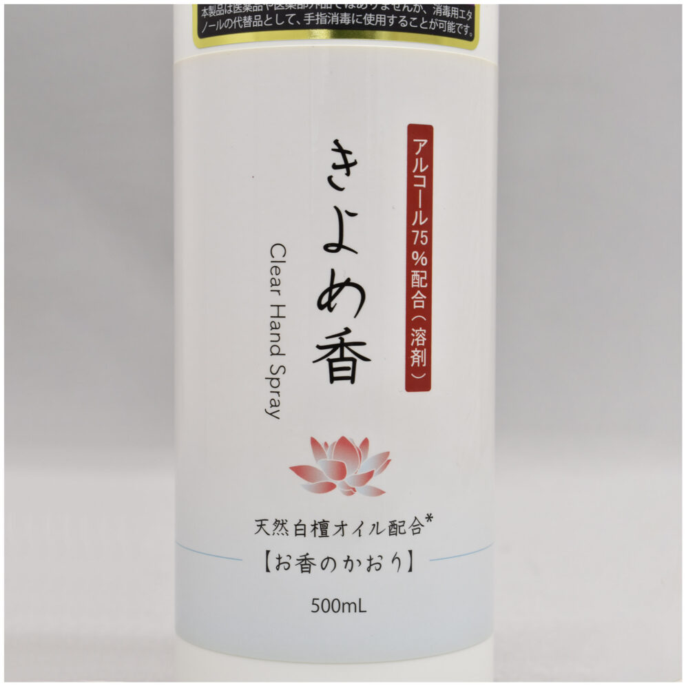 アルコール消毒液での手指の消毒は日常化しています。 手指だけでなく心身ともにクリアするをコンセプトに 塗香というお香とアルコール洗浄の融合を目指した商品になります。 塗香とは神社仏閣で礼拝する前に心身を清めるために使用されるお香です。 白檀を主体にお香の原料である漢方薬を粉末にし数種類を調合して作られています。 『きよめ香 クリーンハンドスプレー』は、塗香を元に考えられました。 本製品はアルコールが75%配合されており、医薬品や医薬部外品ではありませんが、消毒用エタノールの代替品として、手指消毒に使用する事が可能となっています。 お香屋さんが作ったハンドスプレーを是非お試しください。
