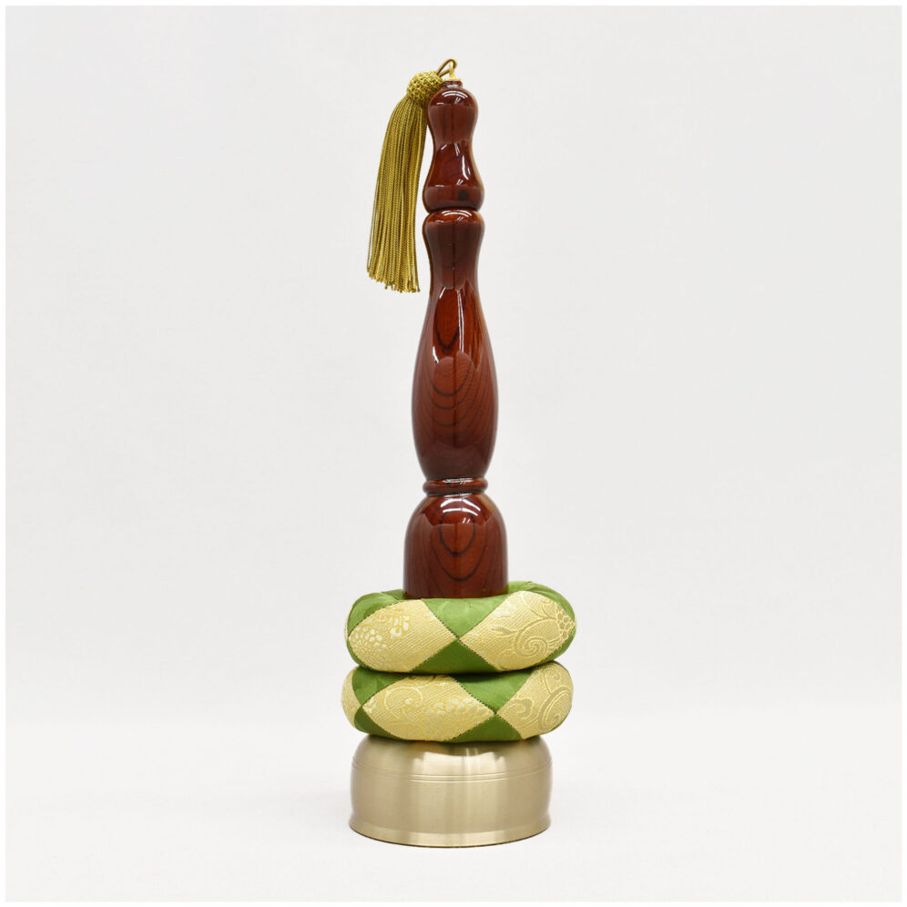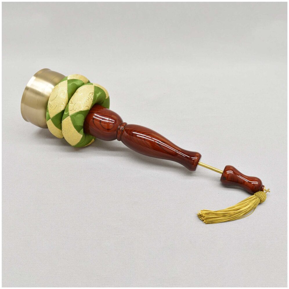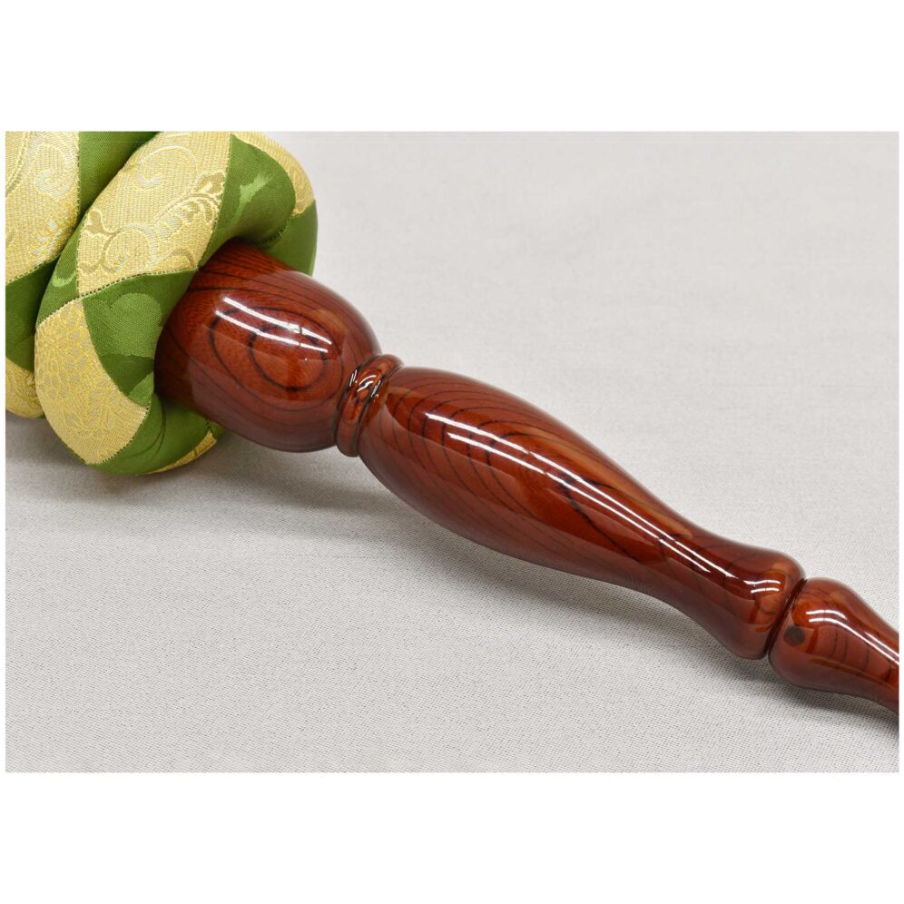 バチが木地呂色漆柄に内蔵されているマグネットでしっかり付くので、作法中や移動中に抜け落ちることが無くなります。 バチには房が付いていますので叩くときにも持ちやすくなってます。 |