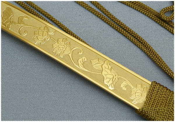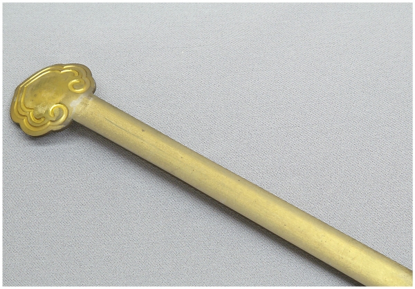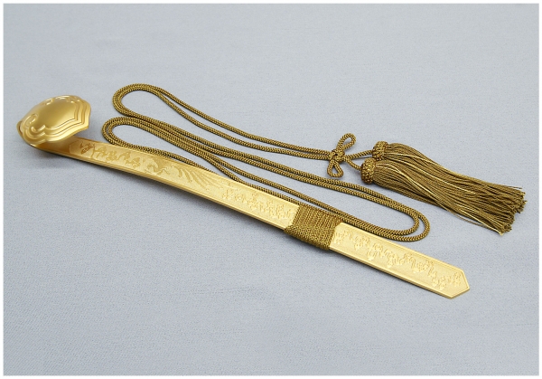 お好みの図柄で彫金いたします。ご相談ください。 模様の回りの丸い粒は蒔魚々子と言い一粒ずつ彫り出す最高級の技術で仕上げてあります。 オリジナルの如意はいかがでしょうか。 後世に残る逸品となると思います。 ご注文頂きましてから、彫金・曲げ加工・メッキ加工を致しますのでお時間いただきます。 |