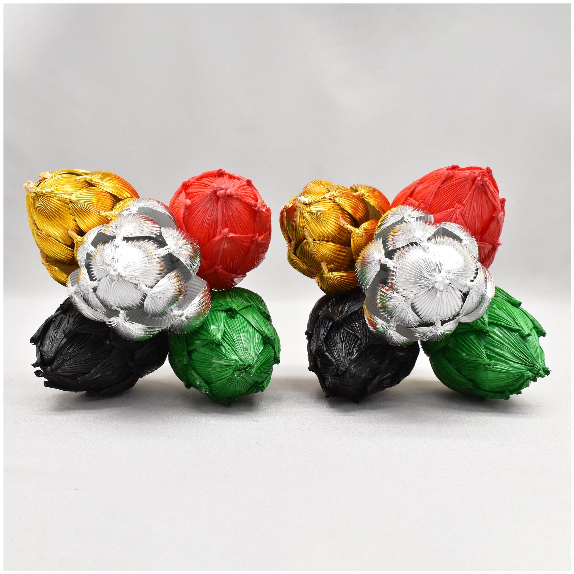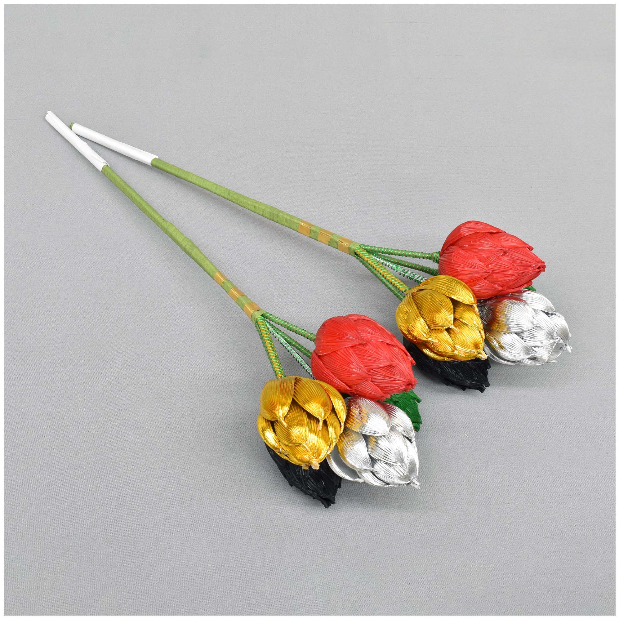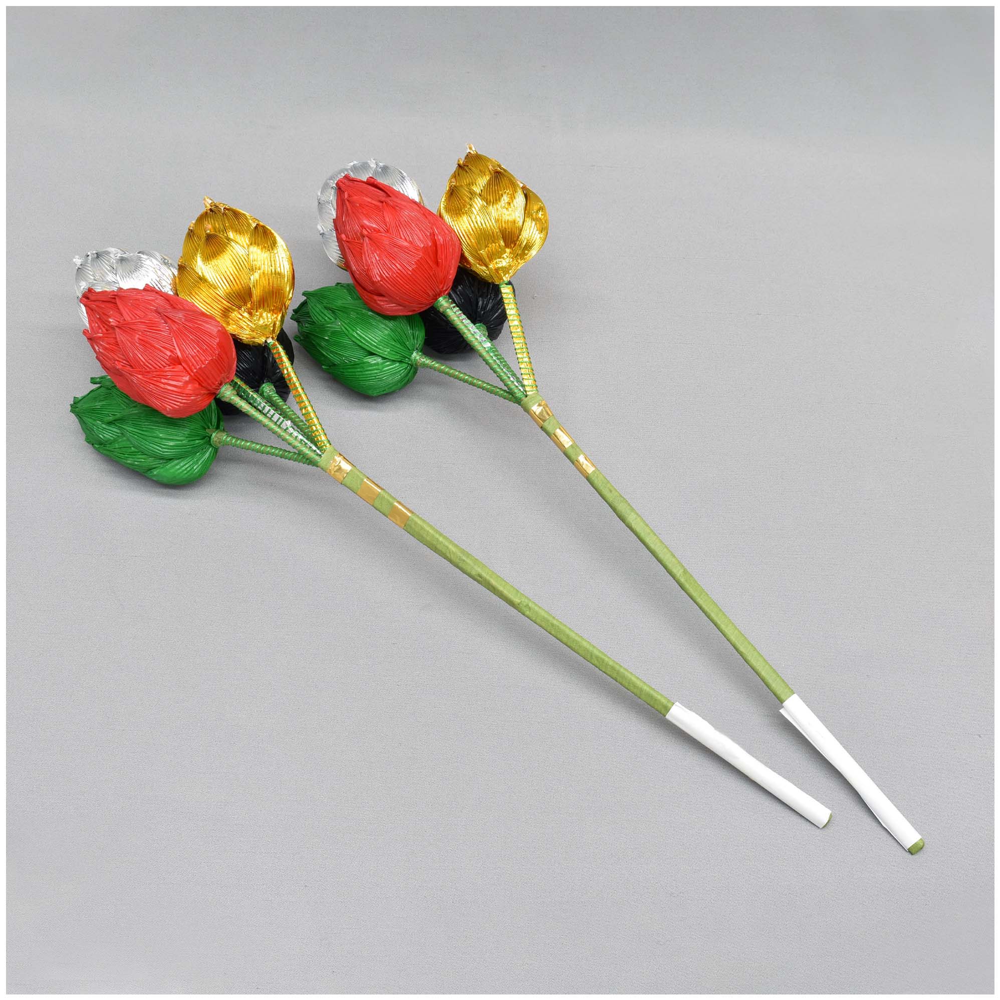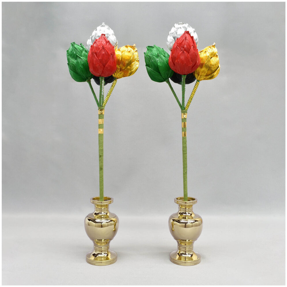 金銀入りの特別仕様の二鋲花です。 通常は白色・青色・黄色・赤色・黒色の五色それぞれ一本ずつ五本一束になっています。 登高座の一つの向机で花鋲に挿して使用されることが多いです。 紙製です。 ※受注生産品になります。 |