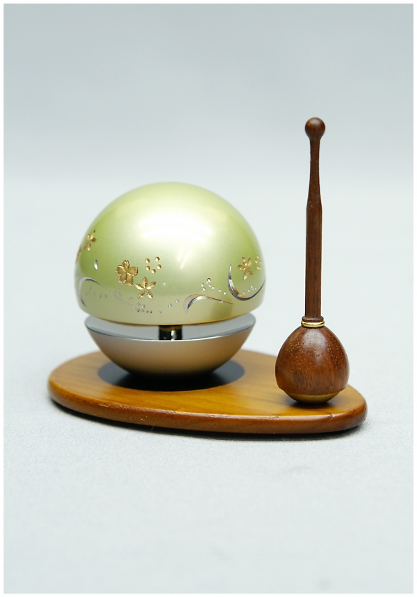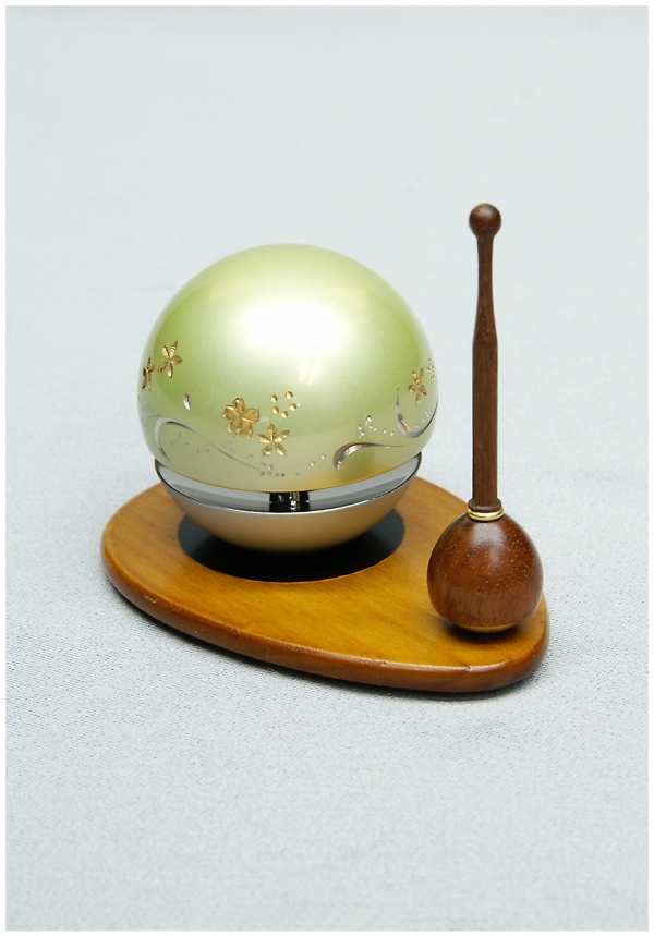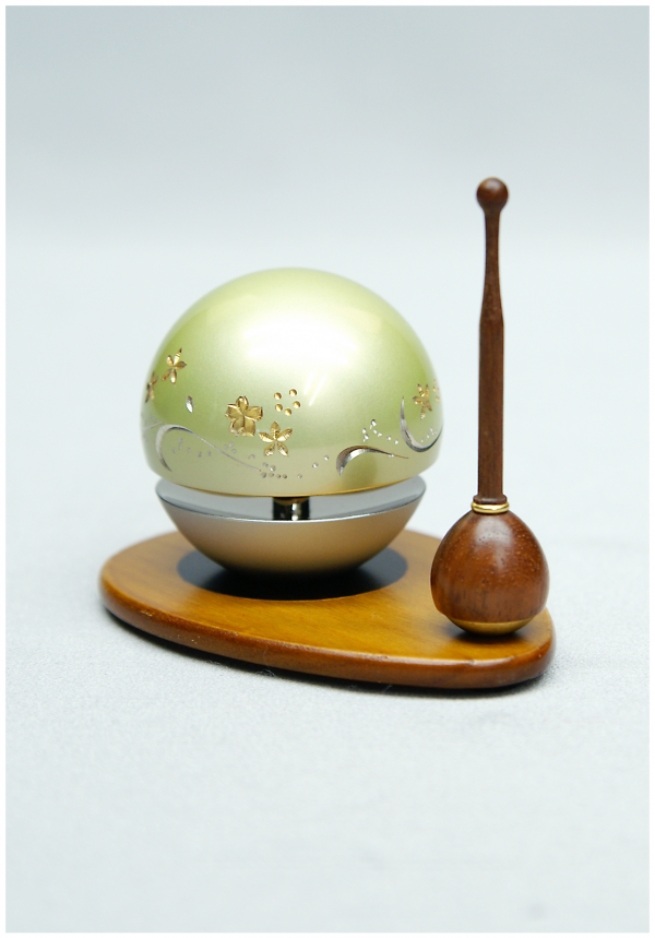 弊社オリジナルカラーのうすみどりに桜が癒しと彩りを演出します。 モダンな小型のお仏壇や玄関先の呼び鈴としてもお使い頂けます。 各宗派でお使いいただけます。 専用りん棒(黒檀・花梨)、りん台は別売りです。 製品の仕様変更などで予告なく変更される場合があります。ご了承下さい。 |