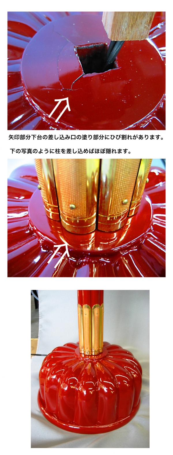 差込時にこねたのか下台の差込口塗部分に ヒビ割れあります 柱を差し込めばほぼ 隠れています 傷みは見た限りではこの箇所 位です全体的に比較的に綺麗です