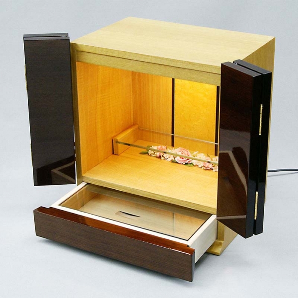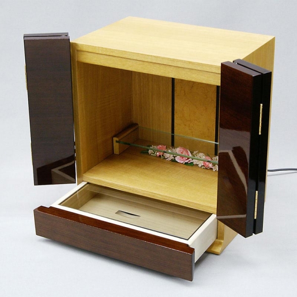 素材/材質 台輪:タモ/薄板貼り 戸板:ウォールナット/薄板貼り 主芯材:木質繊維板(MD) 表面仕上げ:ウレタン仕上 電装:LED照明 原産国:日本 LED照明の電装は差込むだけで簡単に取り付けられます。 フラワーシート・ガラス膳引きは可動式です。 可動式棚(奥行き80mm) 引出し上・ガラス線引き・フラワーシート付き 各宗派でお使い頂けます。 製品の仕様変更などで予告なく変更される場合があります。ご了承下さい。 |