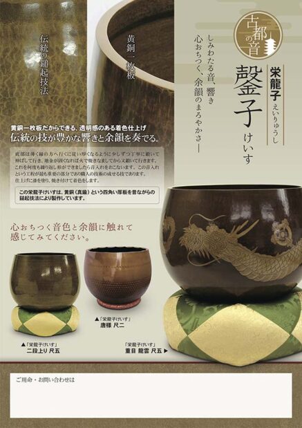 鏧子(けいす) とは、堂の中に置いて使う鐘です。 心おちつく音色と余韻に触れて感じてみて下さい。 匠が鎚起の伝統技術により、1枚の黄銅板より打ち延ばしたものです。 |