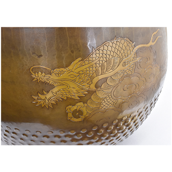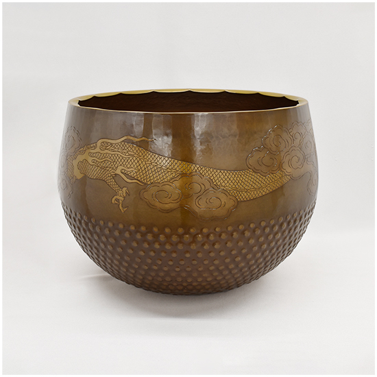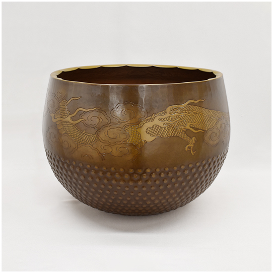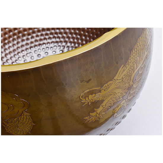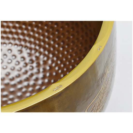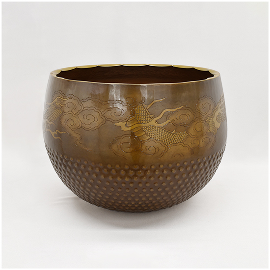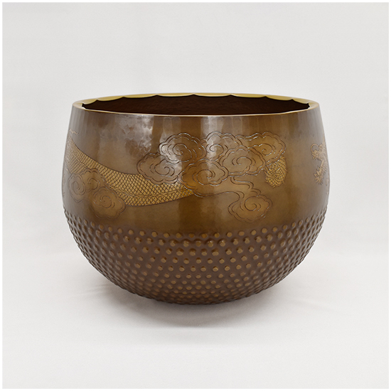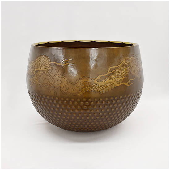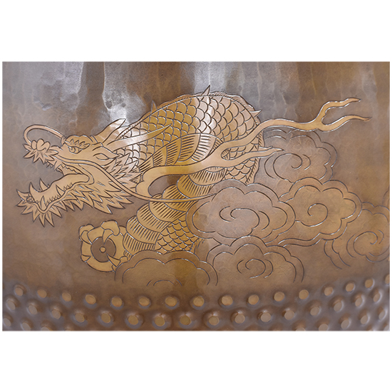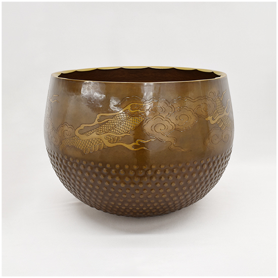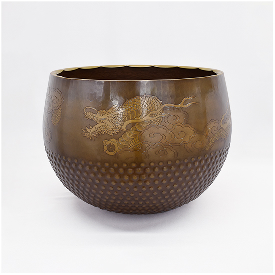 いくつかの装飾が施されています。 唐様といわれる霰の模様を打ち出し加工が施してあります。 縁にはギアと言っています波形の装飾を施してあります。 クルッと一周、龍の彫りが彫金されています。 と豪華なかっこいい逸品に仕上がっています。 心に響く音色と余韻を感じてみて下さい。 |