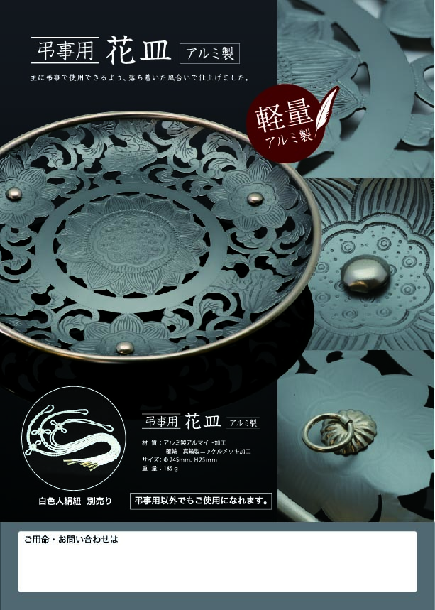 花皿は華籠(けこ、花籠とも書かれます)と同じで宗派により(はなご)(けろう)とも読まれるそうです。 散華(花)に使用する散華(花)を盛るお皿です。