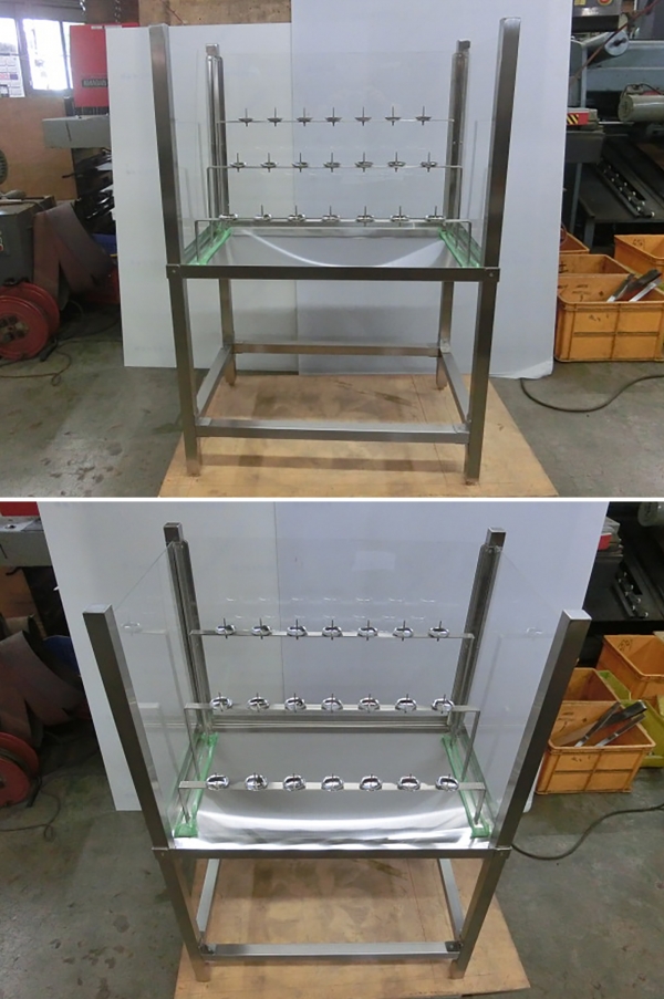 ステンレス製の万灯台作ってみました。 燭台7本立×3段=21本立 ステンレス製ヘアーライン仕上品 三方 アクリル板付き 足にアジャスター付 ごちゃごちゃせずにシンプルにしあげてみました。 工場ブログII(2021.10.12)のご紹介です。 |