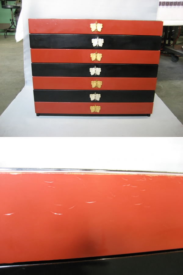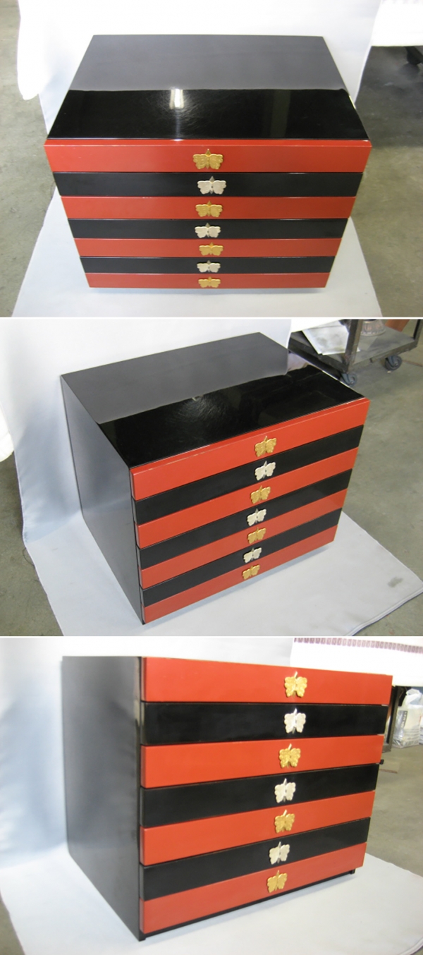 倉庫整理品です。店舗にて展示していました。 黒と朱色塗のチェスト 蝶々型取手 SOLD OUT