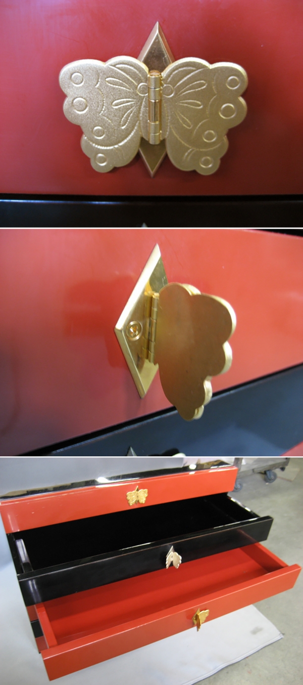 取手が蝶々形をしています。色は朱色に金メッキ 黒に銀メッキです。
