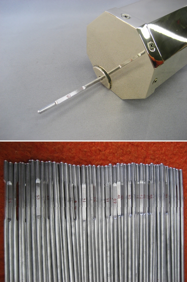 以前販売していた商品です。 重たいためか真鍮製の棒が25番までしか入っていませんでしたので少し改良してアルミ製で100番まで制作してみました。 とりあえず 1本分が完成致しました。残り11本少しずつ進めていく予定です。 盗難防止用の紐取り付け用カンがついています。 アルミ棒はストッパー付ですので棒が抜けずに写真の位置で止まります。 木製の竹製の棒は完全に抜けてしまうので紛失したり悪戯や持ち去られたりして補充しなくてはならなくなりますがこれは抜けないのでその心配はないと思います。 工場ブログII(2020.02.27)のご紹介です。 |