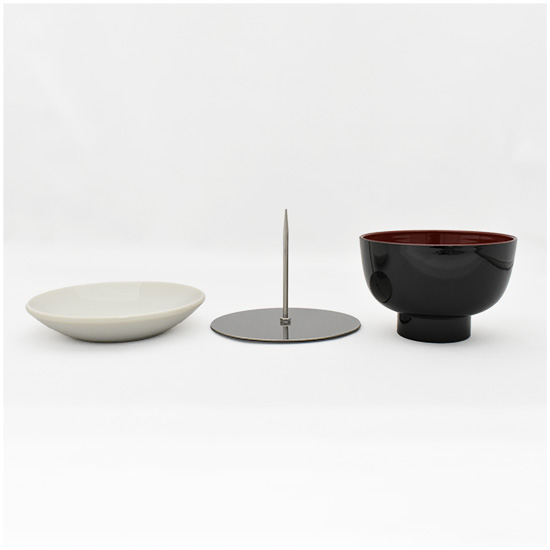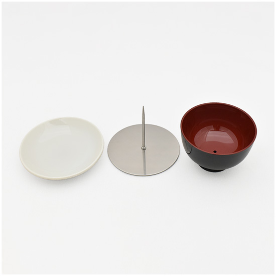 針付台 高さ:約6.5cm 直径:約8.2cm お椀 高さ:約5cm 直径:約7.7cm お皿 高さ:約2cm 直径:9.2cm |