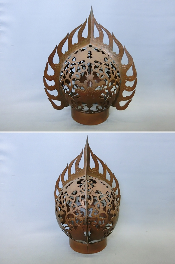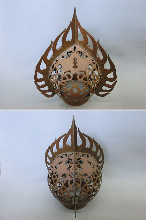 長期保管品です。 唐草模様の擬宝珠(火炎付) 銅製生地保管品 1台 珠横幅約21㎝ 火炎横幅約26.5㎝ 高さ約36㎝ おそらく曼荼羅灯の擬宝珠かと思います。 常夜灯や常灯明に仕立ててみれば如何でしょうか。 工場ブログIIからのご紹介です。2020年11月16日の記事です。 |