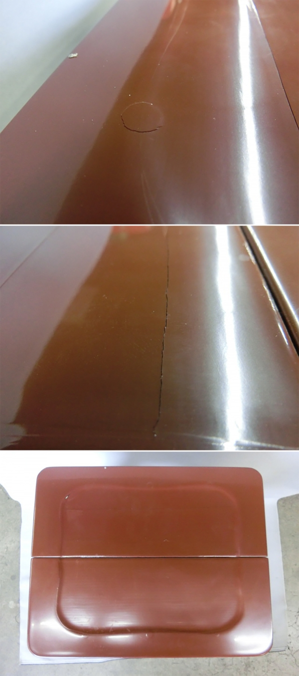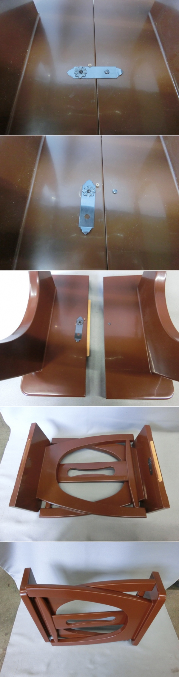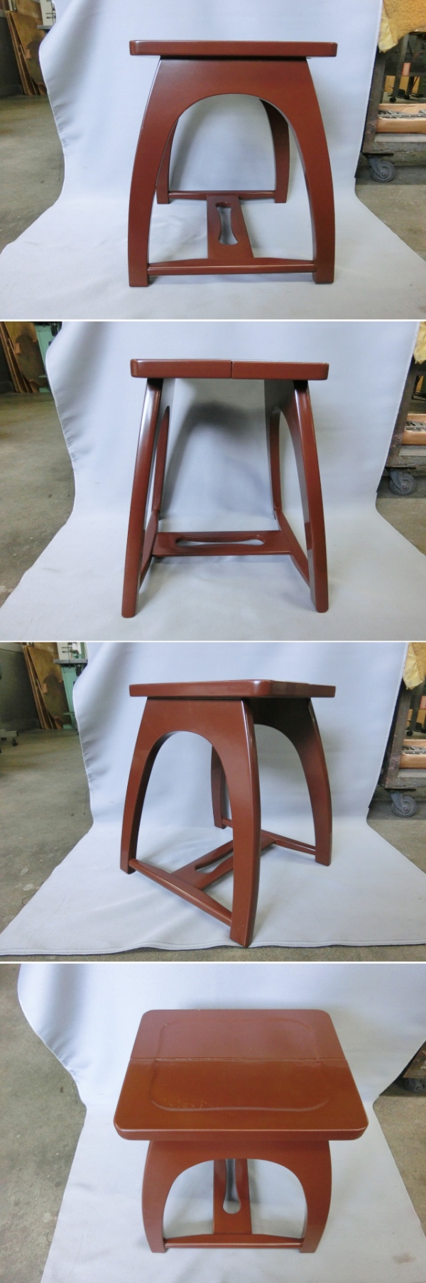 倉庫整理品 長期保管品になります。 折畳椅子(うるみ塗) 1脚 寸法は 座面 32㎝×26㎝ 脚幅 35㎝×35㎝  高さ約39.5㎝ 以前試作で製作したものです。 経年劣化、クスミ、塗部分痛みあります。 座面ダボ浮き  塗部分ひび割れ 座面の裏側 金具を回すと 座面の差し込み分が外れます。 工場ブログII(2021.01.29)のご紹介です。