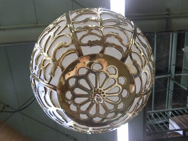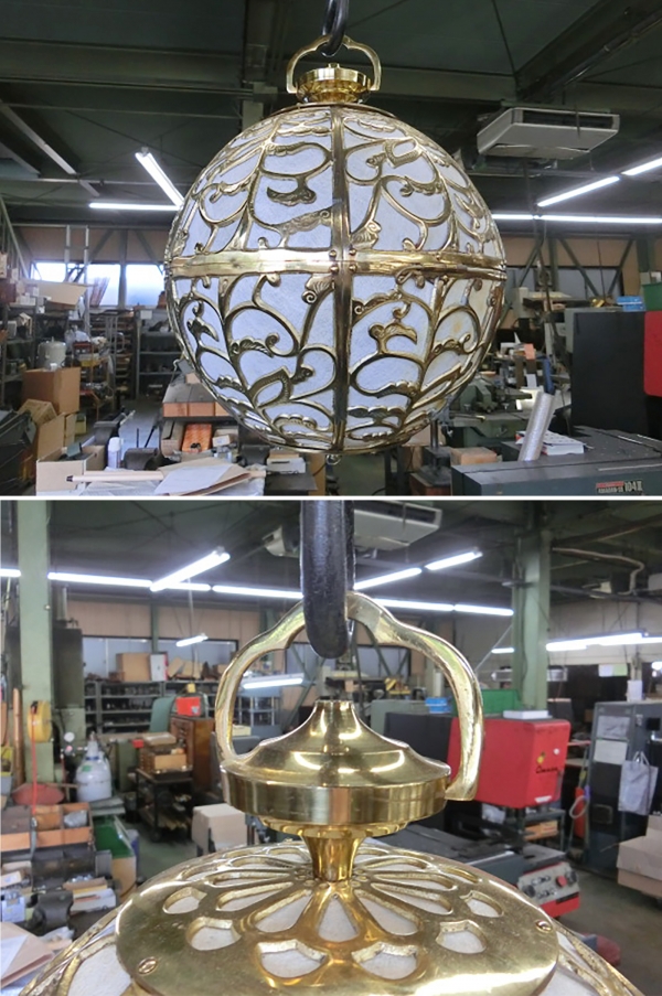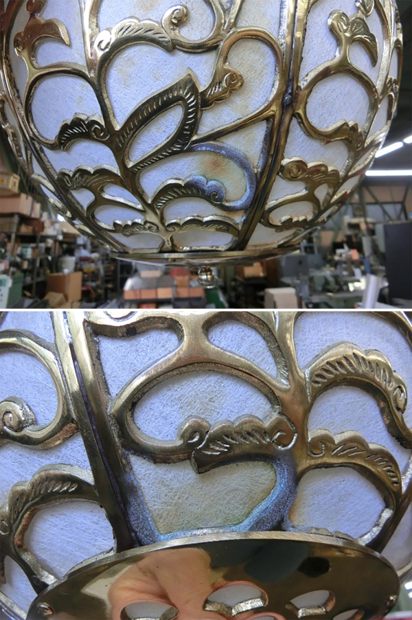 倉庫整理品 長期保管品です。 ランタン  1尺  ミガキ仕上げ品  寸法は 直径約30㎝ 重さ約4㎏ スパン汚れ、青錆等あります。 電装は出荷時に新品を取り付けます(E26電球1灯式) 下部に青錆スパン汚れあります。 工場ブログII(2021.04.12)のご紹介です。