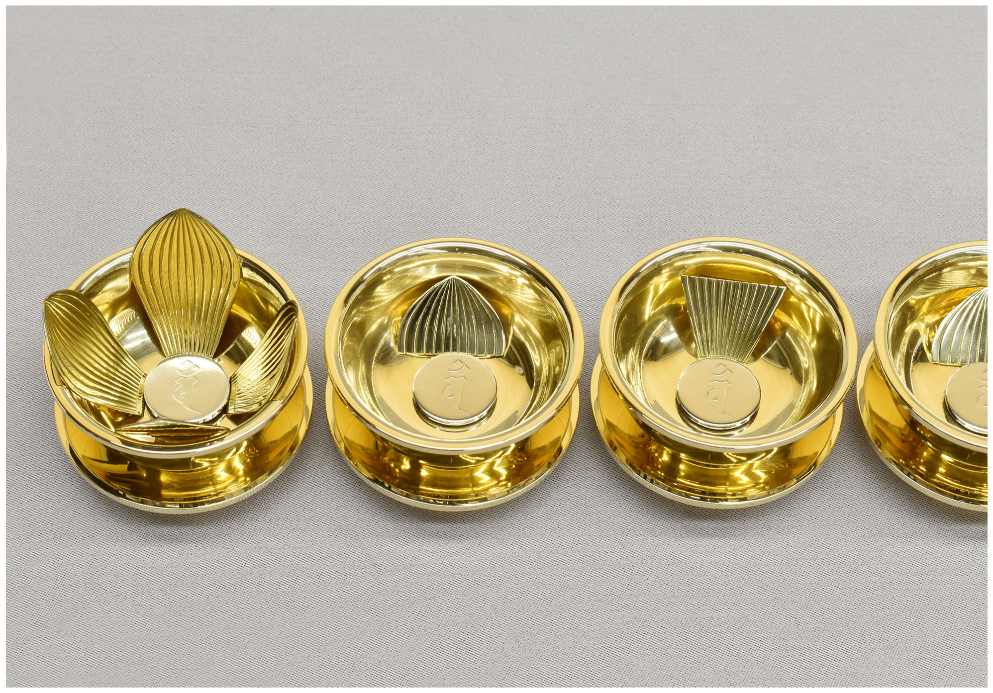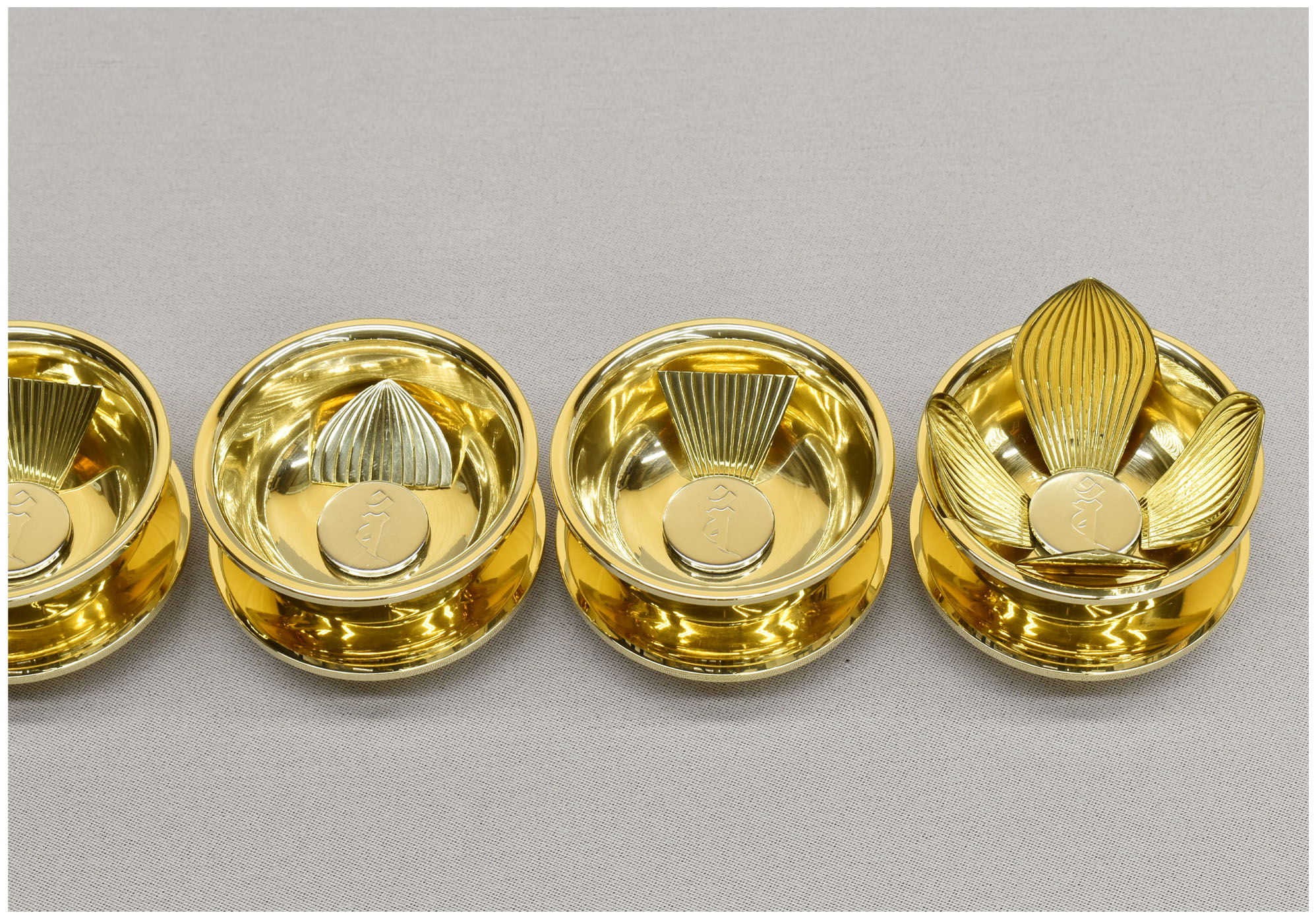 常香蓮華 六器用の常香華です。 本来は蓮華を使うのですが、年中咲いているわけではないので、山にある樒を蓮華の花びらに似ていることから用いられるようになったそうです。 真鍮製で製作しお手入れもしやすくなっています。 丸板は底の中心に置き蓮華を立たせる時の倒れ止めとしてご使用下さい。 また梵字のバンは水を意味しますので、実際の水を入れず水の代用としてお使い下さい。(ご不要の場合は外して下さい。)