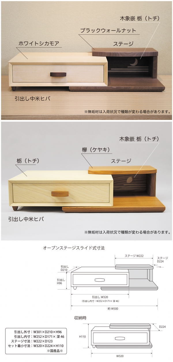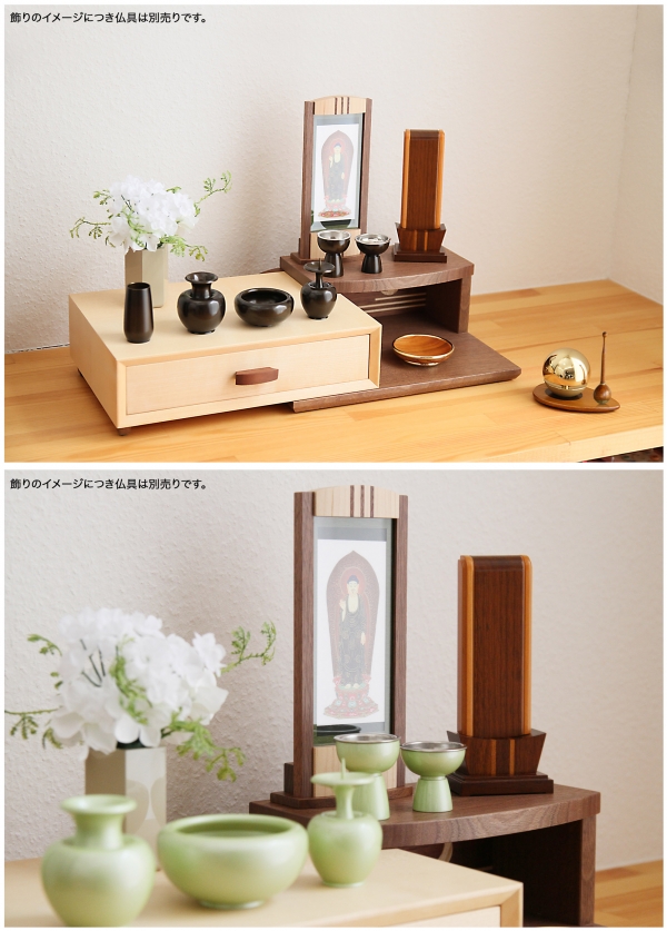 祈りステージType Dは従来のお仏壇の雰囲気とは異なりオープンステージタイプのお仏壇です。 引き出し付き台をスライドする事でサイズが変わり、木象嵌の模様が現れ飾り方のバリエーションが色々と楽しめます。 手元供養のお仏壇としても最適です。 ※無垢材は入荷状況で種類が変わる場合があります。 ブラックウォールナットステージタイプ ステージ・取手/ブラックウォールナット 引き出し本体/トチ材(その他) 引出し中/米ヒバ材又は桐材 木象嵌:トチ材 原産国/日本 ケヤキステージタイプ ステージ・取手/ケヤキ 引き出し本体/トチ材(その他) 引出し中/米ヒバ材又は桐材 木象嵌:トチ材 原産国/日本 |